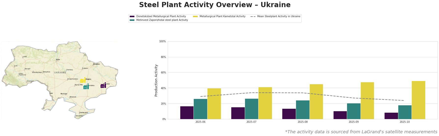 Conversely, the Metinvest Zaporizhstal steel plant had a relatively stable activity level, while Metallurgical Plant Kametstal showed slight increases, peaking at 49% in October. This correlates favorably with the increased production levels indicated in the aforementioned reports.