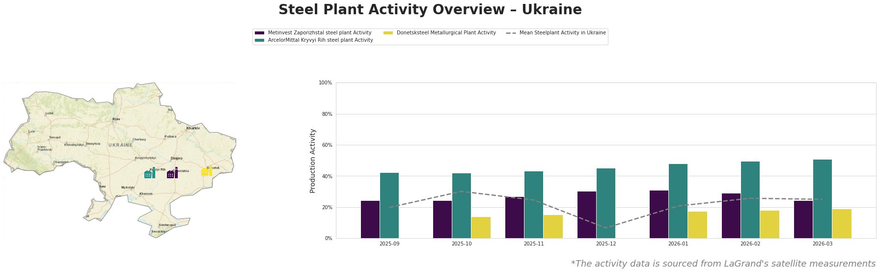 Bar chart and satellite map of steel production activity in Ukraine
