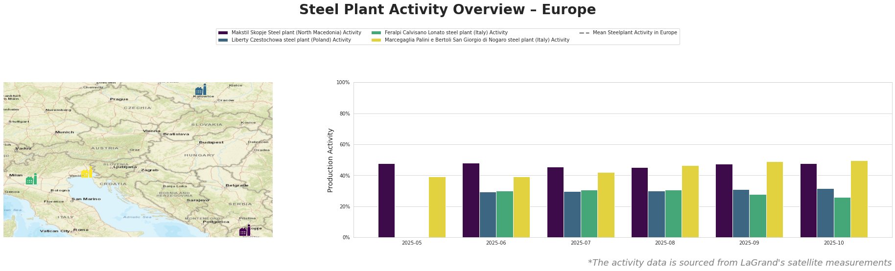 Across the observed period, the “Mean Steelplant Activity in Europe” fluctuated, with highs in July and August. Makstil Skopje Steel plant in North Macedonia maintained a relatively stable activity level around 45-48%. Liberty Czestochowa steel plant in Poland showed a slight upward trend, moving from 30% in June to 32% in October. Feralpi Calvisano Lonato steel plant in Italy experienced a slight decrease, from 30% in June to 26% in October. Marcegaglia Palini e Bertoli San Giorgio di Nogaro steel plant in Italy demonstrated the most consistent growth, increasing from 39% in May/June to 50% in October, marking the highest activity level among the monitored plants.