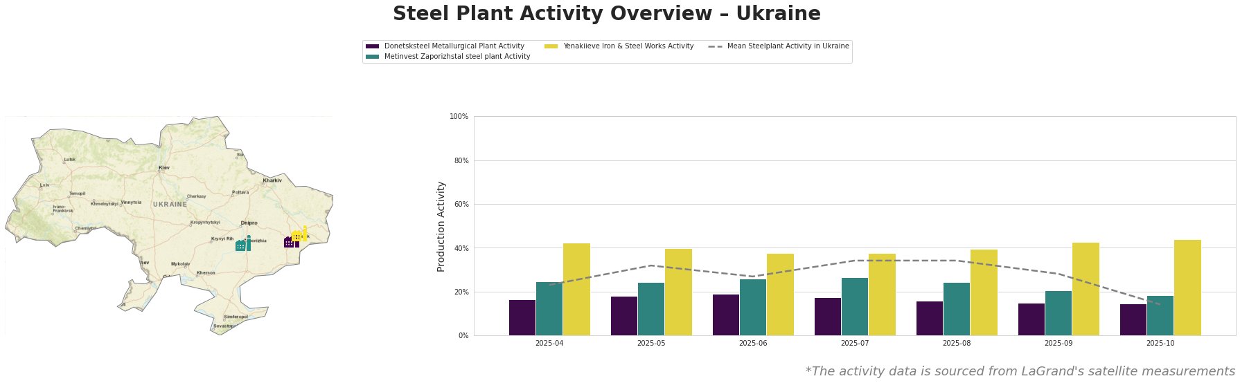 • Prioritize securing supply contracts with Yenakiieve Iron & Steel Works. Satellite data suggests relative operational stability and output (44% activity in October), making it a potentially reliable source for rebar and channels.