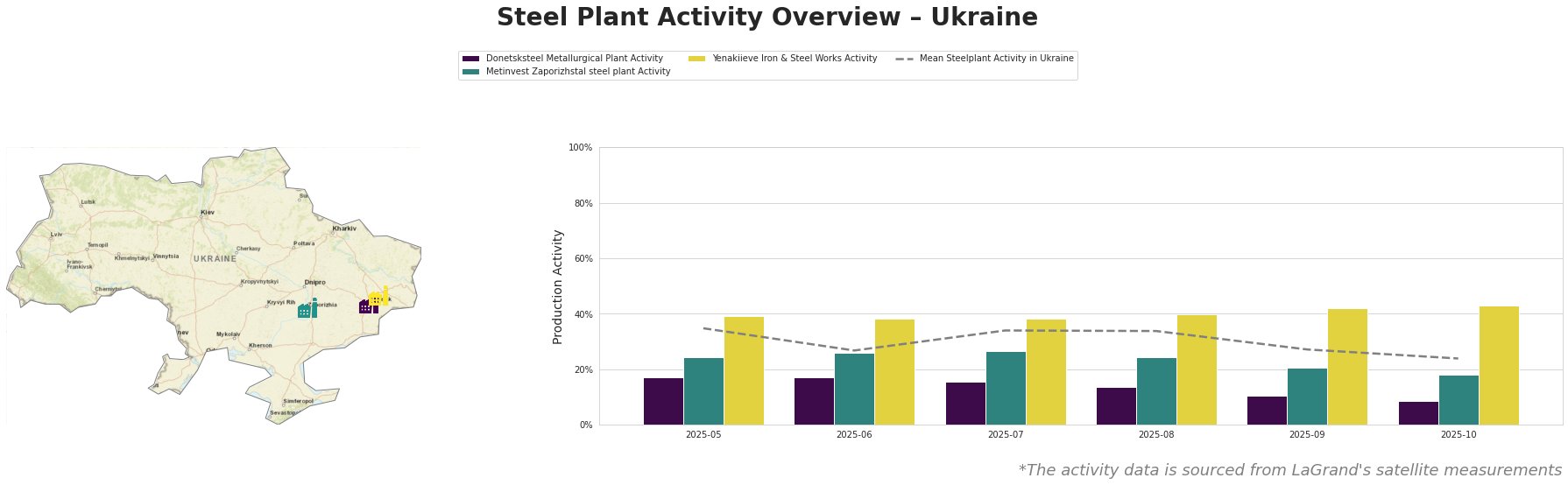 The mean steel plant activity in Ukraine shows a declining trend from May (35.0%) to October (24.0%), with notable fluctuations. Donetsksteel Metallurgical Plant shows a continuous decline from 17.0% in May to 9.0% in October, consistently operating below the national average. Metinvest Zaporizhstal steel plant also experienced a decline, from 24.0% in May to 18.0% in October. Yenakiieve Iron & Steel Works presents a contrasting picture, with activity rising from 39.0% in May to 43.0% in October, significantly exceeding the national average in the observed period. No explicit connection between these activity levels and the provided news articles can be directly inferred.