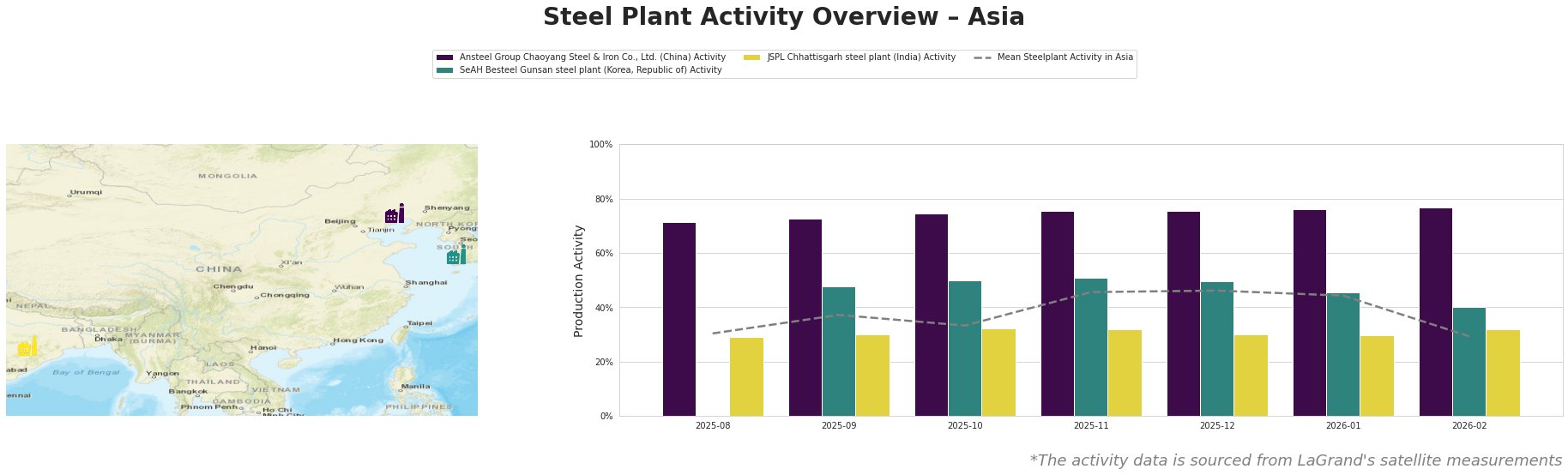 SeAH Besteel Gunsan’s activity, although fluctuating, reached a high of 51.0% in November 2025 and a drop to 40.0% by February 2026, which does not clearly correlate with the news provided. Meanwhile, the mean activity level across the Asian plants indicates increasing volatility that indicates potential market shifts, but no direct articles link to these specific changes.